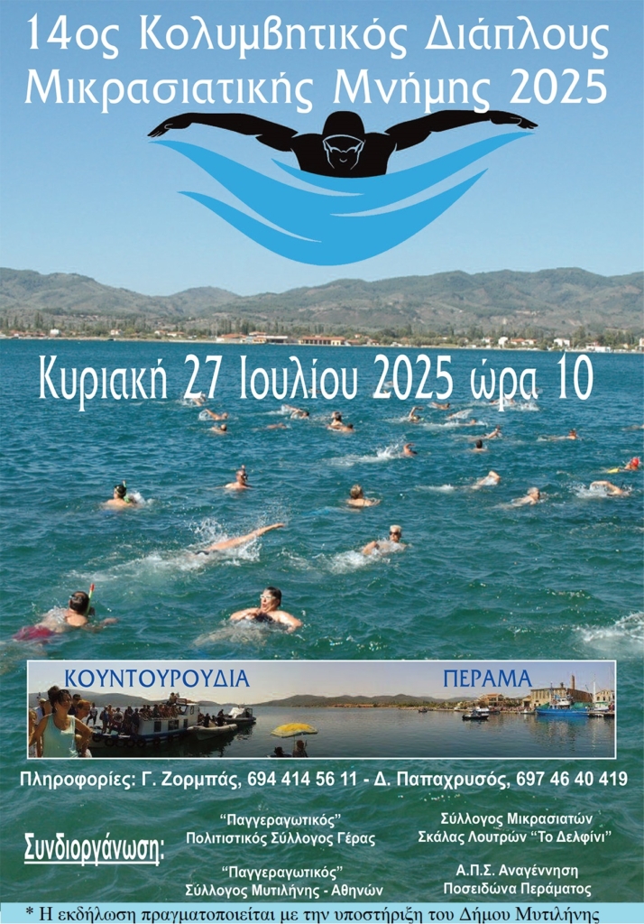 Την Κυριακή 27 Ιουλίου 2025, στις 10 το πρωί, θα πραγματοποιηθεί ο «14ος Κολυμβητικός Διάπλους Μικρασιατικής Μνήμης» του Κόλπου Γέρας, με αφετηρία την Κουντουρουδιά και τερματισμό το Πέραμα.