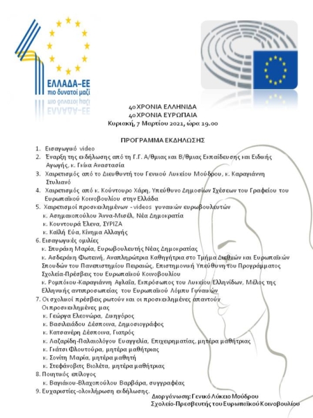 Διαδικτυακή εκδήλωση-αφιέρωμα στη Γιορτή της Γυναίκας και στα 40 χρόνια από την ένταξη της Ελλάδας στην Ευρωπαϊκή Ένωση διοργανώνει το Γενικό Λύκειο Μούδρου, σχολείο-πρεσβευτής του Ευρωπαϊκού Κοινοβουλίου με πληθώρα εκλεκτών προσκεκλημένων.
