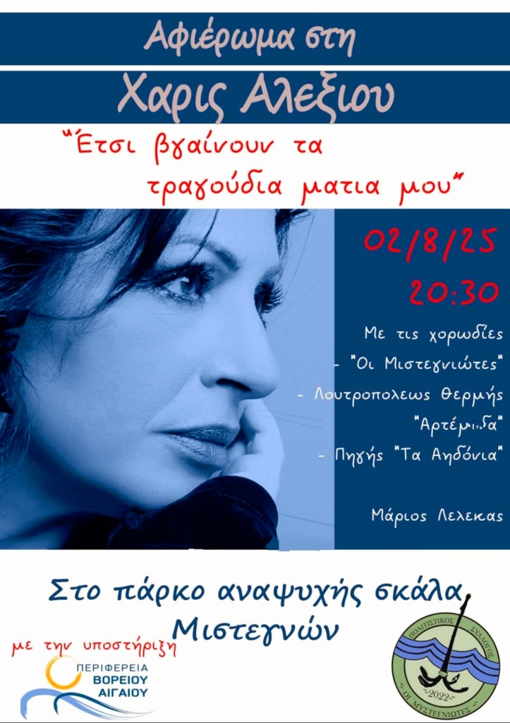 Ο πολιτιστικός Σύλλογος Μυστεγνιωτών σας προσκαλεί σε μια μουσική βραδιά αφιερωμένη στη μεγάλη ερμηνεύτρια Χάρις Αλεξίου, με τραγούδια που αγαπήσαμε και μας συγκίνησαν.