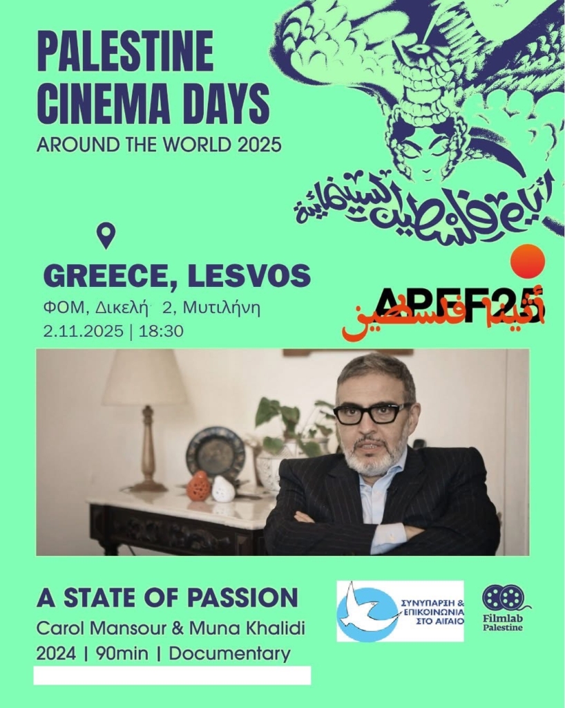 Την Κυριακή 2 Νοεμβρίου 2025, στις 6.30μ.μ., θα προβληθεί στην αίθουσα του ΦΟΜ – Φιλοτεχνικού Ομίλου Μυτιλήνης «Ο Θεόφιλος» (Δικελί 2, Επάνω Σκάλα), η ταινία-ντοκιμαντέρ «A State of Passion» (2024, 90’, Παλαιστίνη – Λίβανος) των Carol Mansour και Muna Khalidi, με ελληνικούς και αγγλικούς υπότιτλους.