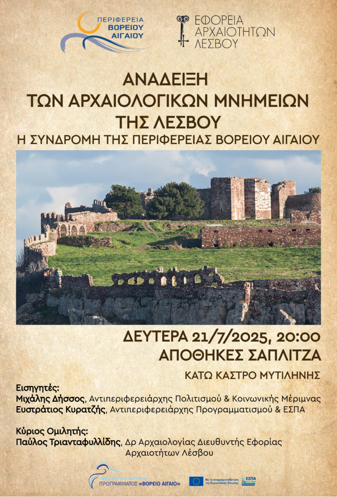 Η Περιφέρεια Βορείου Αιγαίου διοργανώνει σήμερα Δευτέρα 21.07.2025 στις 20.00 στις Αποθήκες Σαπλιτζά (Κάτω Κάστρο Μυτιλήνης) εκδήλωση με θέμα «Ανάδειξη των Αρχαιολογικών Μνημείων της Λέσβου. Η συνδρομή της Περιφέρειας Βορείου Αιγαίου».
