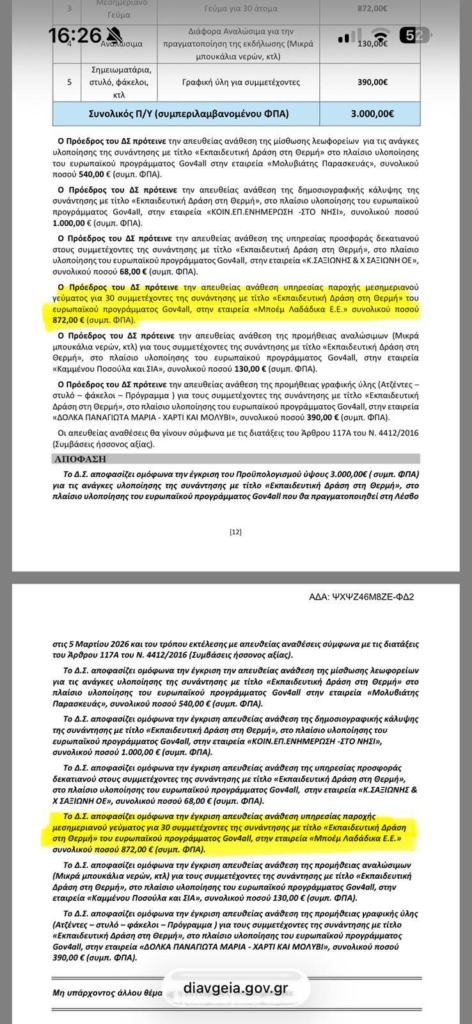 ΑΠΟΚΑΛΥΨΗ: Αντιδημαρχός λαμβάνει απευθείας ανάθεση γεύματος 872€ – Θέματα διαφάνειας στο Δήμο Μυτιλήνης