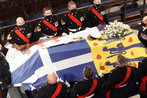 Στην κηδεία του δούκα του Εδιμβούργου, πρίγκιπα Φιλίππου, το φέρετρο ήταν σκεπασμένο με...