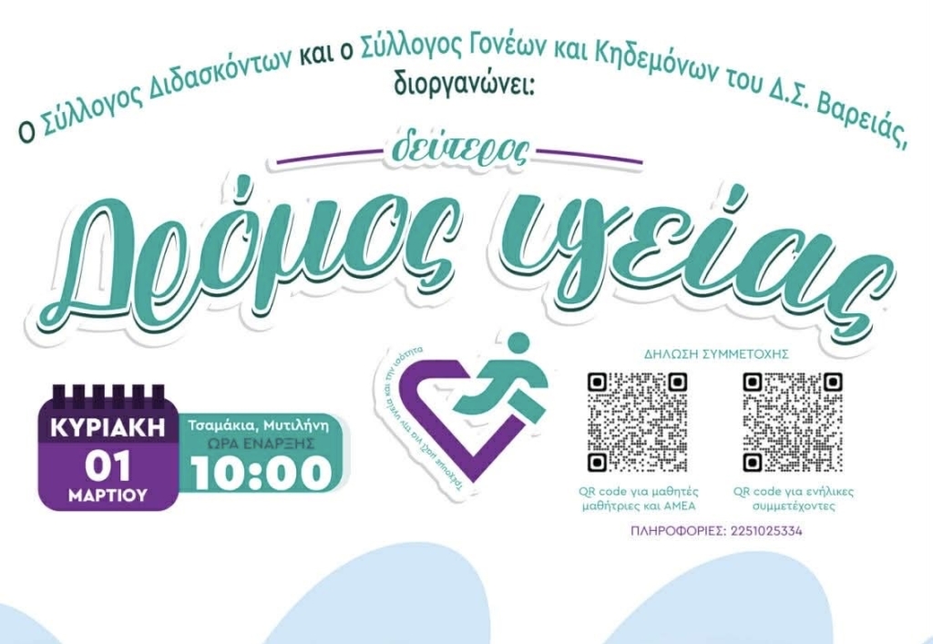 Ο Σύλλογος Διδασκόντων και ο Σύλλογος Γονέων και Κηδεμόνων του Δημοτικού Σχολείου Βαρειάς διοργανώνουν τον Δεύτερο Δρόμο Υγείας στον πεζόδρομο της περιοχής «Τσαμάκια» την Κυριακή 1 Μαρτίου, ημερομηνία που σηματοδοτεί συμβολικά την έναρξη της άνοιξης.
