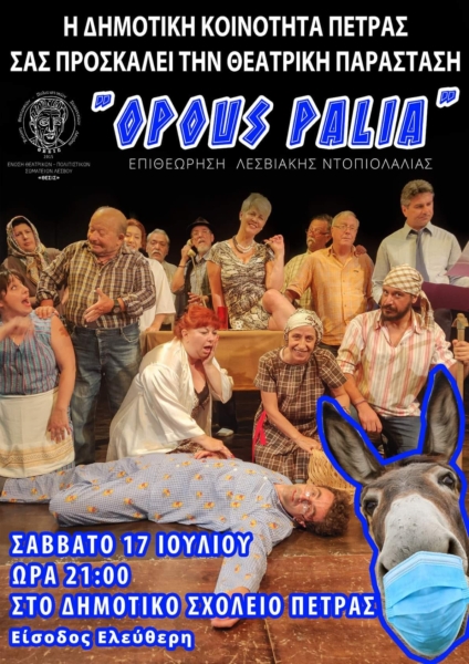 Η ‘Ένωση Θεατρικών Πολιτιστικών Σωματείων Λέσβου “ΘΕΣΙΣ”, παρουσιάζει την επιθεώρηση σε λεσβιακή ντοπιολαλιά με τίτλο “Όπους παλιά”, στην αυλή του Δημοτικού Σχολείου Πέτρας, το Σάββατο, 17 Ιουλίου 2021 και ώρα 9 μμ.
