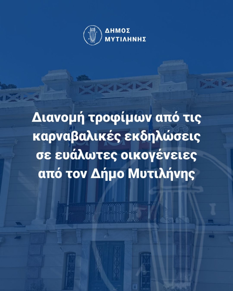 Σε ευάλωτες οικογένειες θα διανεμηθούν τρόφιμα, που συγκεντρώθηκαν από τον Δήμο Μυτιλήνης κατά τη διάρκεια των καρναβαλικών εκδηλώσεων, την προηγούμενη εβδομάδα, μέσω των Υπηρεσιών Κοινωνικής Πρόνοιας και του «Βοήθεια στο Σπίτι».