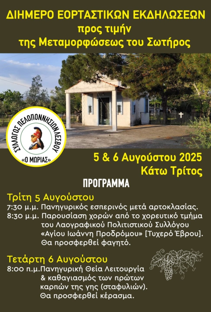 Διήμερο Εορταστικών Εκδηλώσεων προς τιμήν της Μεταμορφώσεως του Σωτήρος στις 5 και 6 Αυγούστου 2025 στο Κάτω Τρίτος στις εγκαταστάσεις του Συλλόγου Πελοποννησίων Λέσβου ο Μωριάς.