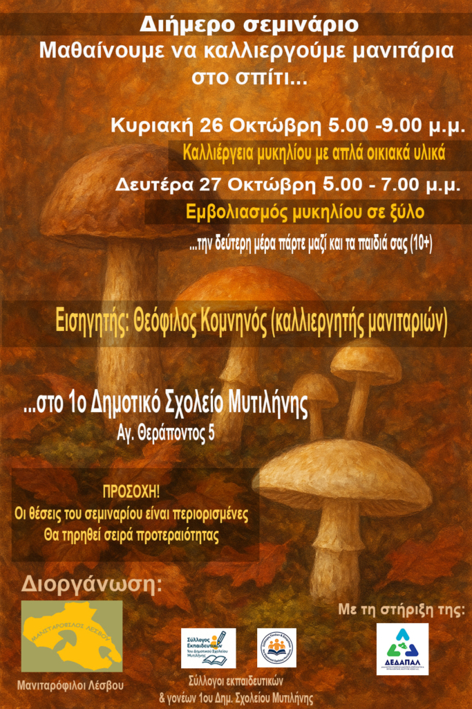 Ο Μυκητολογικός Περιβαλλοντικός Σύλλογος «Μανιταρόφιλοι Λέσβου», κι οι Σύλλογοι Εκπαιδευτικών και Γονέων του 1ου Δημοτικού Σχολείου Μυτιλήνης, με τη στήριξη της ΔΕΔΑΠΑΛ, διοργανώνουν ένα διήμερο βιωματικό σεμινάριο αφιερωμένο στην καλλιέργεια μανιταριών με απλά και οικιακά μέσα.