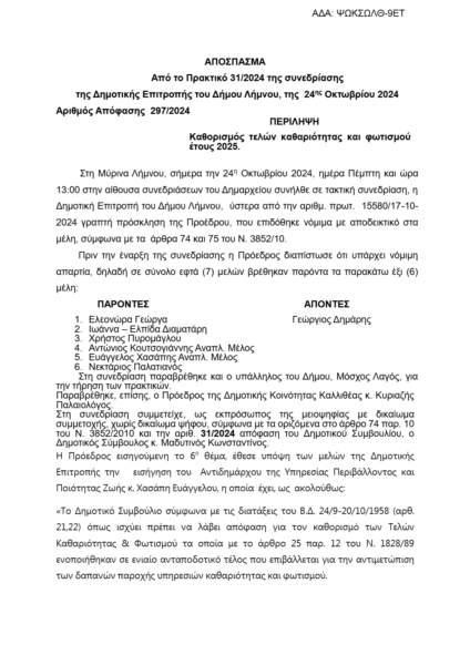 Συνεδρίασε την Πέμπτη 24 Οκτωβρίου η Δημοτική Επιτροπή του Δήμου Λήμνου και μετά από διαλογική συζήτηση όπως αναφέρεται στην απόφαση …..”Εισηγείται στο Δημοτικό Συμβούλιο του Δήμου Λήμνου, για το έτος 2025 να υπάρχει μεταβολή με αύξηση στους αντίστοιχους συντελεστές των τελών καθαριότητας και φωτισμού ”
