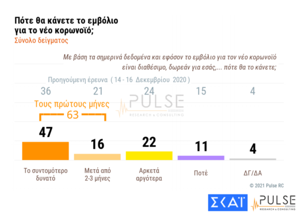 Στο πότε θα κάνουν το εμβόλιο, το 63% συνολικά απαντά το συντομότερο δυνατό (47%) ή μετά από 2 με 3 μήνες (16%) έναντι 57% συνολικά στη δημοσκόπηση Δεκεμβρίου. Το 22% των ερωτώμενων απαντά αρκετά αργότερα (έναντι 24%) ενώ το 11% δηλώνει ποτέ (έναντι 15% στην προηγούμενη σφυγμομέτρηση).