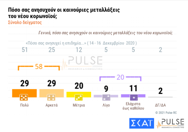 Στο κατά πόσον ανησυχούν οι μεταλλάξεις του κοροναϊού τους πολίτες, το 58% των ερωτηθέντων συνολικά απαντά πολύ (29%) και αρκετά (29%), το 20% απαντά μέτρια, και το 20% λίγο (9%) και ελάχιστα με καθόλου (11%).