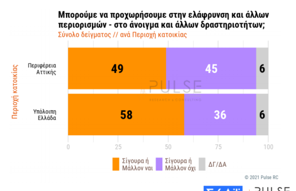 Όσον αφορά το ενδεχόμενο ελάφρυνσης και άλλων περιορισμών ή το άνοιγμα άλλων δραστηριοτήτων στη χώρα μας με βάση τα σημερινά δεδομένα, το 55% συνολικά απαντά σίγουρα ναι (20%) ή μάλλον ναι (35%), ενώ το 39% απαντά μάλλον όχι (30%), και σίγουρα όχι (9%).
