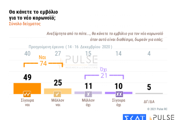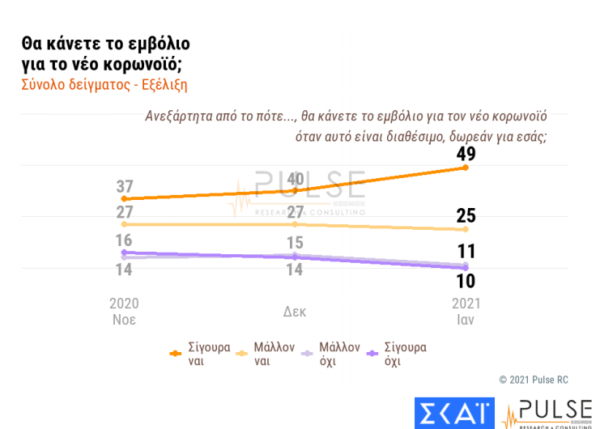 Eιδικότερα, αναφορικά με το αν θα κάνουν το εμβόλιο για τον ιό, το 74% των ερωτηθέντων δηλώνει σίγουρα ναι (49%) ή μάλλον ναι (25%) έναντι 67% στην προηγούμενη δημοσκόπηση του Δεκεμβρίου, ενώ 21% συνολικά απαντά μάλλον όχι (11%) και σίγουρα όχι (10%) έναντι 29% στην προηγούμενη έρευνα. Άξιο αναφοράς ειναι το γεγονός ότι το Νοέμβριο το 37% των ερωτηθέντων έλεγαν ότι σίγουρα θα εμβολιαστούν, έναντι του 40% το Δεκέμβριο και του 49% τον Ιανουάριο.