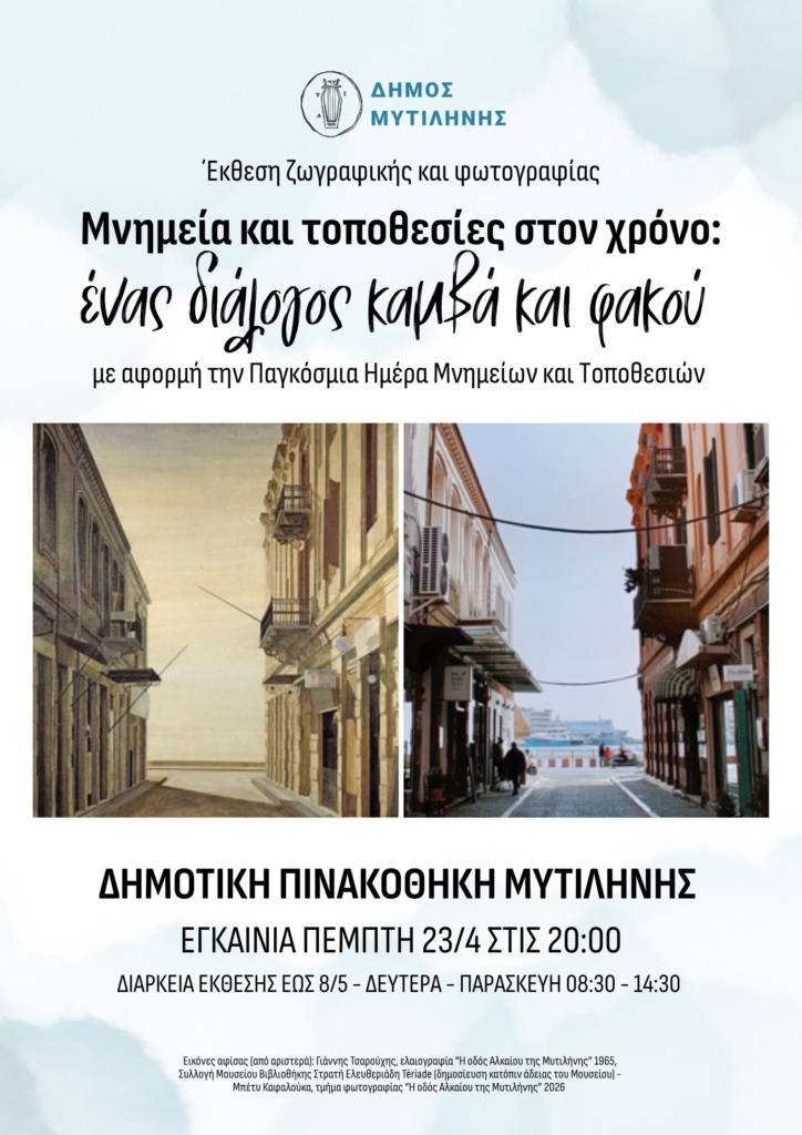 Τα εγκαίνια της Έκθεσης Ζωγραφικής και Φωτογραφίας «Μνημεία και τοποθεσίες στο χρόνο: ένας διάλογος καμβά και φακού», θα πραγματοποιηθούν την Πέμπτη, 23 Απριλίου 2026, στις 20:00 το βράδυ, στη Δημοτική Πινακοθήκη Μυτιλήνης, σε συνέχεια του ομώνυμου διαγωνισμού φωτογραφίας που πραγματοποιήθηκε το προηγούμενο διάστημα, ενώ θα πραγματοποιηθούν και οι βραβεύσεις των έργων που ξεχώρισαν. Παράλληλα, με αφορμή την Παγκόσμια Ημέρα Μνημείων και Τοποθεσιών, ο Δήμος Μυτιλήνης διοργανώνει στις 18:00 το απόγευμα της ίδιας μέρας ξενάγηση σε σημεία ενδιαφέροντος στην Προκυμαία Μυτιλήνης, σε συνεργασία με τους ξεναγούς της ΚΟΙΝΣΕΠ «Παρέα στη Λέσβο».