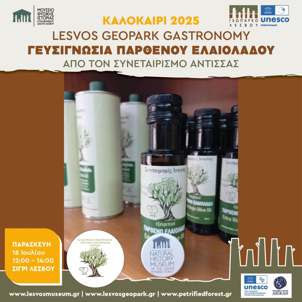 Γευσιγνωσία του εξαιρετικά παρθένου ελαιόλαδου του Αγροτικού Συνεταιρισμού Άντισσας θα πραγματοποιηθεί την Παρασκευή 18 Ιουλίου και ώρα 12.00-14.00 στους χώρους του Μουσείου Φυσικής Ιστορίας Απολιθωμένου Δάσους Λέσβου στο Σίγρι.