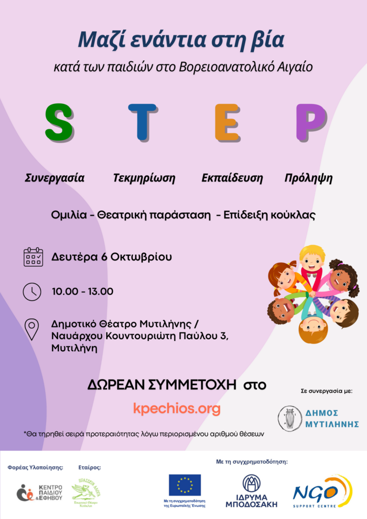 Το έργο «Μαζί ενάντια στη βία κατά των παιδιών στο Βορειοανατολικό Αιγαίο – STEP» έρχεται στη Λέσβο για μια εκδήλωση ενημέρωσης και ευαισθητοποίησης με στόχο την πρόληψη και καταπολέμηση της βίας κατά των παιδιών.