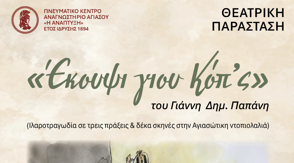 Την ιλαροτραγωδία σε τρεις πράξεις και δέκα σκηνές στην Αγιασώτικη ντοπιολαλιά «Έκουψι γιου Κοπ’ς» του Γιάννη Δημ. Παπάνη θα παρουσιάσει για πρώτη φορά η Θεατρική ομάδα του Αναγνωστηρίου Αγιάσου, την Κυριακή,