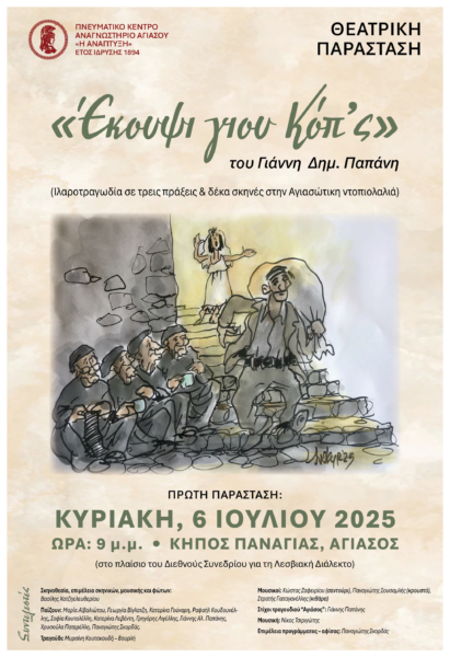 6 Ιουλίου 2025, στις 9μμ, στον «Κήπο της Παναγίας», στο πλαίσιο του Διεθνούς Φεστιβάλ για τη Λεσβιακή Διάλεκτο με ελεύθερη είσοδο. Δεύτερη Παράσταση, 10 Αυγούστου 2025, στις 9μμ, στον «Κήπο της Παναγίας»
