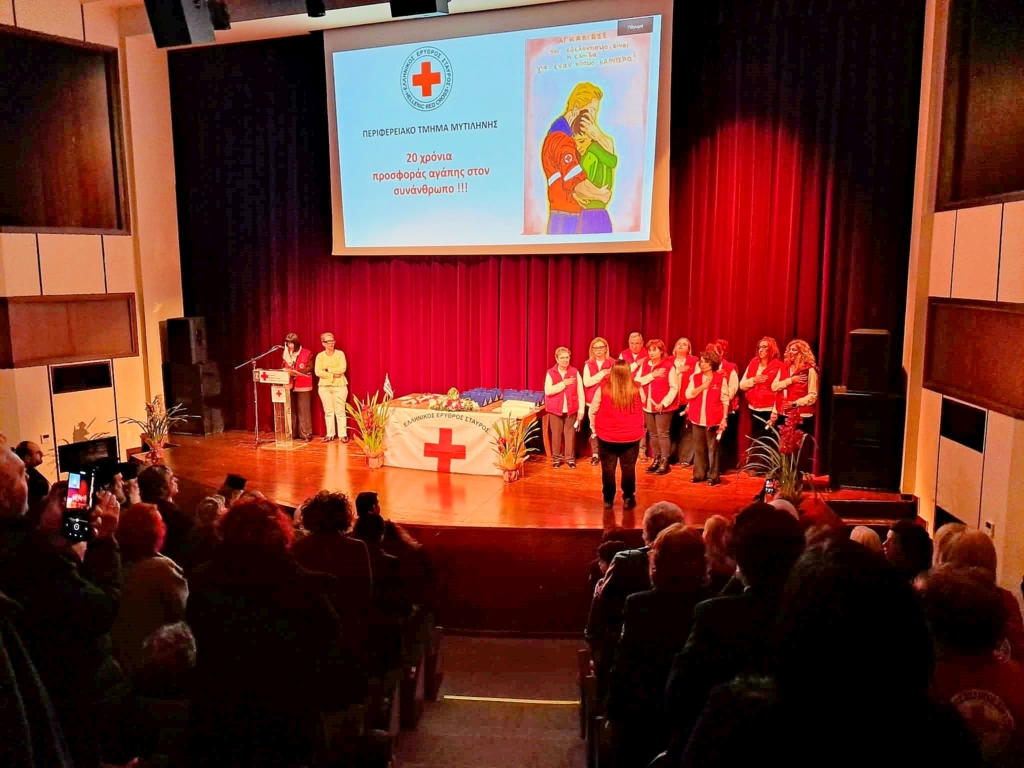 Η εκδήλωση με αφορμή την συμπλήρωση 20 ετών δράσης & προσφοράς αγάπης των εθελοντών του Περιφερειακού Τμήματος Μυτιλήνης του Ελληνικού Ερυθρού Σταυρού, πραγματοποιήθηκε με μεγάλη επιτυχία την Παρασκευή 20 Φεβρουαρίου στο Δημοτικό Θέατρο Μυτιλήνης, παρουσία του Προέδρου του Ελληνικού Ερυθρού Σταυρού DrΑντώνιου Αυγερινού, του Σεβασμιώτατου Μητροπολίτη Μυτιλήνης, Ερεσού & Πλωμαρίου κ.κ. Ιάκωβου, του Γενικού Γραμματέα Αιγαίου & Νησιωτικής Πολιτικής κ. Εμμανουήλ Κουτουλάκη, του Δημάρχου Μυτιλήνης κ. Παναγιώτη Χριστόφα, εκπροσώπων των Τοπικών Αρχών, στελεχών της Εκπαιδευτικής Κοινότητας, εκπροσώπων Συλλόγων & Εθελοντικών Οργανώσεων και πλήθους πολιτών.