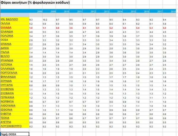Η… προσγείωση του φόρου κατοχής ακινήτων χαρακτηρίζεται μονόδρομος για δύο λόγους. Κατ’ αρχάς, το ακίνητο στοχοποιήθηκε στη δεκαετία των Μνημονίων και αντιμετωπίστηκε ως η… χήνα με τα χρυσά αυγά, «τιμωρώντας» τους ιδιοκτήτες τους, χωρίς να συνυπολογίζεται η «βουτιά» των εισοδημάτων τους, άρα και η φοροδοτική τους ικανότητα. Τα συγκριτικά στοιχεία του ΟΟΣΑ είναι λίαν αποκαλυπτικά, καθώς δείχνουν ότι οι φόροι επί των ακινήτων στην Ελλάδα αντιστοιχούν στο 5% των φορολογικών εσόδων, όταν μπαίνοντας στο «τούνελ» το 2010 ήταν μόλις 0,8%! Πρόκειται για την τρίτη υψηλότερη «επίδοση» στην Ευρώπη, μετά το Ηνωμένο Βασίλειο και τη Γαλλία!