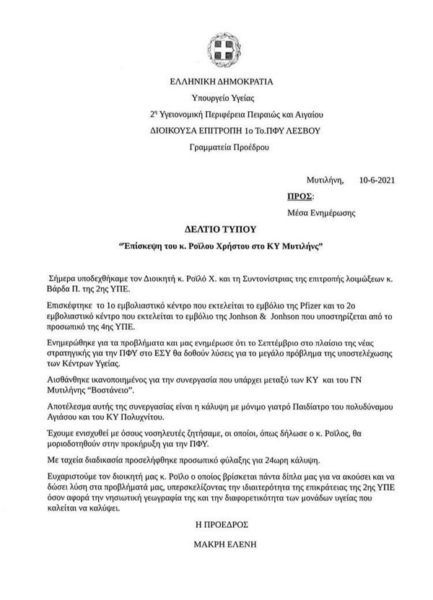 Επισκέφτηκε το 1ο εμβολιαστικό κέντρο που εκτελείται το εμβόλιο της Pfizer και το 2ο εμβολιαστικό κέντρο που εκτελείται το εμβόλιο της Jonhson & Jonhson που υποστηρίζεται από το προσωπικό της 4ης ΥΠΕ.