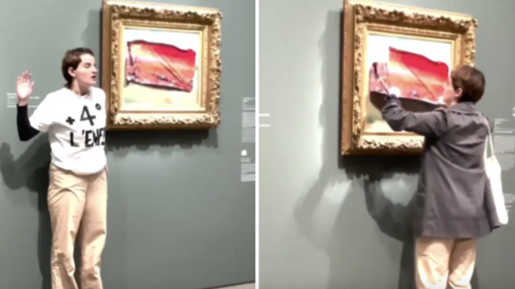 Βίντεο της οργάνωσης Riposte alimentaire, που ευθύνεται για σειρά επιθέσεων κατά έργων τέχνης, που αναρτήθηκε στο Χ δείχνει γυναίκα που παρουσιάζεται ως «στρατευμένη πολίτης» να κολλά στον ιμπρεσιονιστικό πίνακα που αποτυπώνει τοπίο με παπαρούνες ένα αυτοκόλλητο πόστερ με εικόνα αποκάλυψης σε κόκκινο χρώμα.