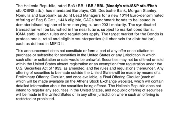 Το πρώτο ομόλογο του 2021 θα είναι 10ετές και ως σύμβουλοι έκδοσης ορίστηκαν οι Barclays, Citi, Deutsche Bank, Morgan Stanley, Nomura, Eurobank.
