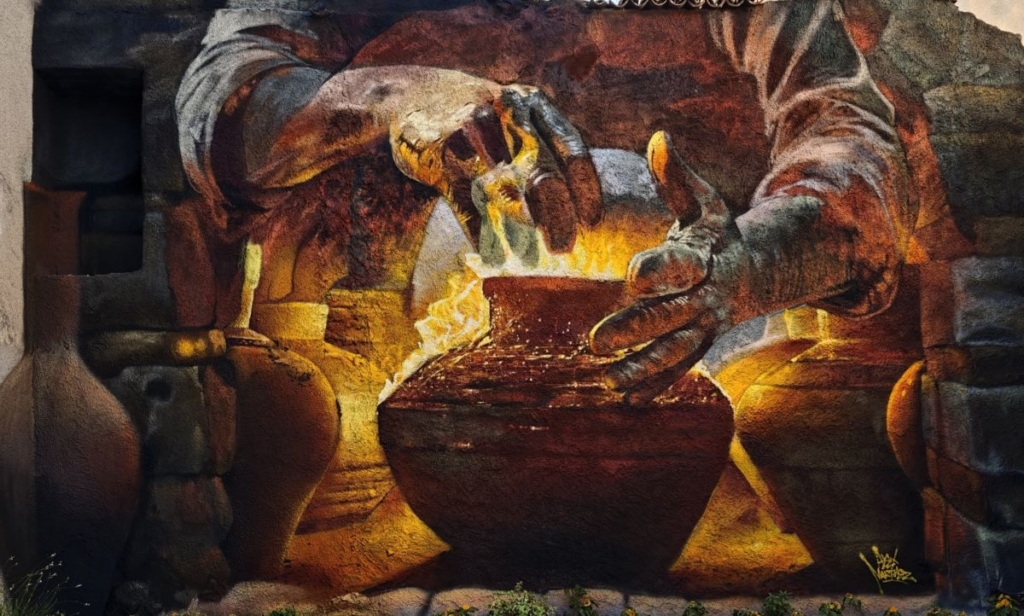 Η τοιχογραφία αντλεί το θέμα της από τον μύθο του Προμηθέα, που χάρισε τη φωτιά στον άνθρωπο, ανοίγοντας τον δρόμο για την ανάπτυξη του πολιτισμού, των τεχνών και των επαγγελμάτων. Η φωτιά, σε αυτή την ερμηνεία, δεν είναι μόνο μέσο επιβίωσης, αλλά σύμβολο δημιουργικής δύναμης και τεχνολογικής εξέλιξης.