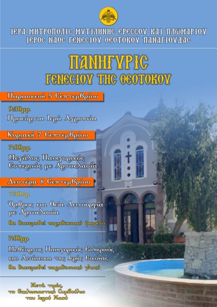 Η Ενορία μας γιορτάζει τη μεγάλη εορτή της Γεννήσεως της Θεοτόκου και σας προσκαλεί όλους να συμμετάσχετε στις ιερές και εορταστικές εκδηλώσεις στον Ιερό Ναό Παναγιούδας.