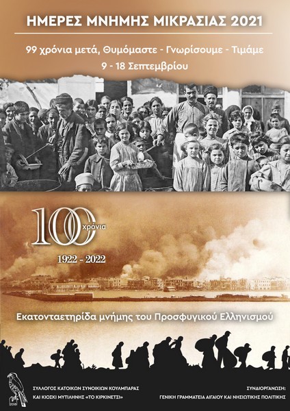 Ξεκινάει αύριο Πέμπτη 9 Σεπτεμβρίου, στις 8 το βράδυ στον αύλειο χώρο της Γενικής Γραμματείας Αιγαίου και Νησιωτικής Πολιτικής στην οδό Μικράς Ασίας 2 στο Κιόσκι, η σειρά εκδηλώσεων με τίτλο «Ημέρες μνήμης Μικρασίας 2021 – 99 χρόνια μετά Θυμόμαστε, Γνωρίζουμε, Τιμάμε» που οργανώνει ο Σύλλογος κατοίκων Συνοικιών Κουλμπάρα και Κιόσκι Μυτιλήνης «το κιρκινέτσι».