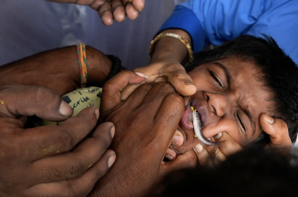 Αφού μαζέψει το ζωντανό ψάρι σε μια πλαστική σακούλα γεμάτη νερό, το κάθε άτομο το δίνει σε έναν συνοδό που συνεργάζεται με την οικογένεια Μπαθίνη, ο οποίος σφίγγει μια κίτρινη φυτική πάστα στο στόμα του ψαριού και τον βοηθά να το καταπιεί.