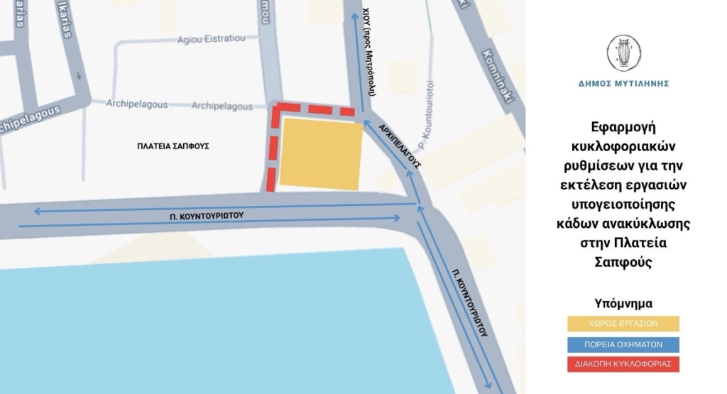 Προσωρινές κυκλοφοριακές ρυθμίσεις τίθενται σε ισχύ από την Τετάρτη, 29 Οκτωβρίου, στην πλατεία Σαπφούς, στο πλαίσιο του έργου που υλοποιεί ο Δήμος Μυτιλήνης με τίτλο “Δημιουργία Γωνιών Ανακύκλωσης και Υπογειοποίηση κάδων ανακύκλωσης σε κεντρικά σημεία της πόλης”.