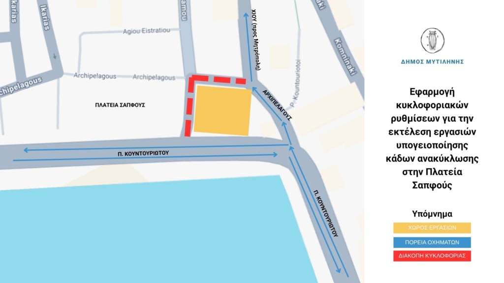 Κυκλοφοριακές ρυθμίσεις στην πλατεία Σαπφούς για την εκτέλεση εργασιών υπογειοποίησης κάδων ανακύκλωσης από το Δήμο Μυτιλήνης