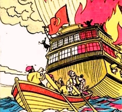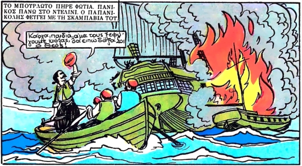 # Γι’ αυτό και όλοι οι ναύτες από τα καταστρώματα, πυροβολούσαν τον πηδαλιούχο και τον αρχηγό για να εξουδετερώσουν το πυρπολικό που ερχόταν κατά πάνω τους