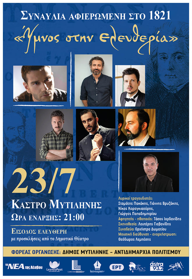 Στα πλαίσια του Λεσβιακού Καλοκαιριού, συναυλία αφιερωμένη στο 1821 ” Ύμνος στην Ελευθερία “. Η συναυλία θα πραγματοποιηθεί στο Κάστρο Μυτιλήνης 23/7, ώρα έναρξης 21:00 με Είσοδο Ελεύθερη από τον Δήμο Μυτιλήνης.