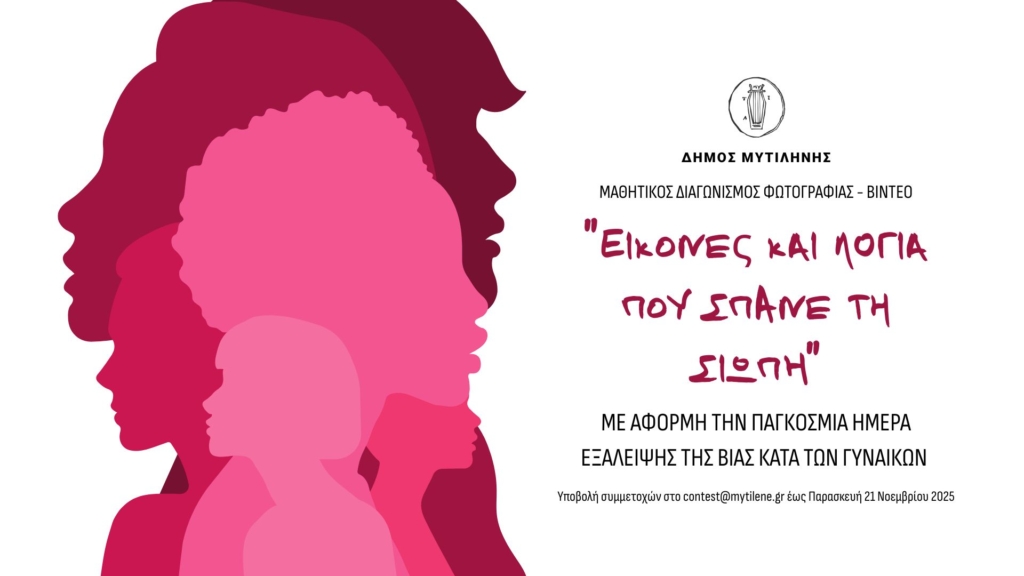 Διαγωνισμό Βίντεο και Φωτογραφίας με θέμα «Εικόνες και λόγια που σπάνε τη σιωπή» διοργανώνει ο Δήμος Μυτιλήνης και η Δημοτική Επιτροπή Ισότητας, στο πλαίσιο δράσεων ενημέρωσης και ευαισθητοποίησης της τοπικής κοινωνίας με αφορμή την Παγκόσμια Ημέρα Εξάλειψης της Βίας κατά των Γυναικών, που γιορτάζεται στις 25 Νοεμβρίου.