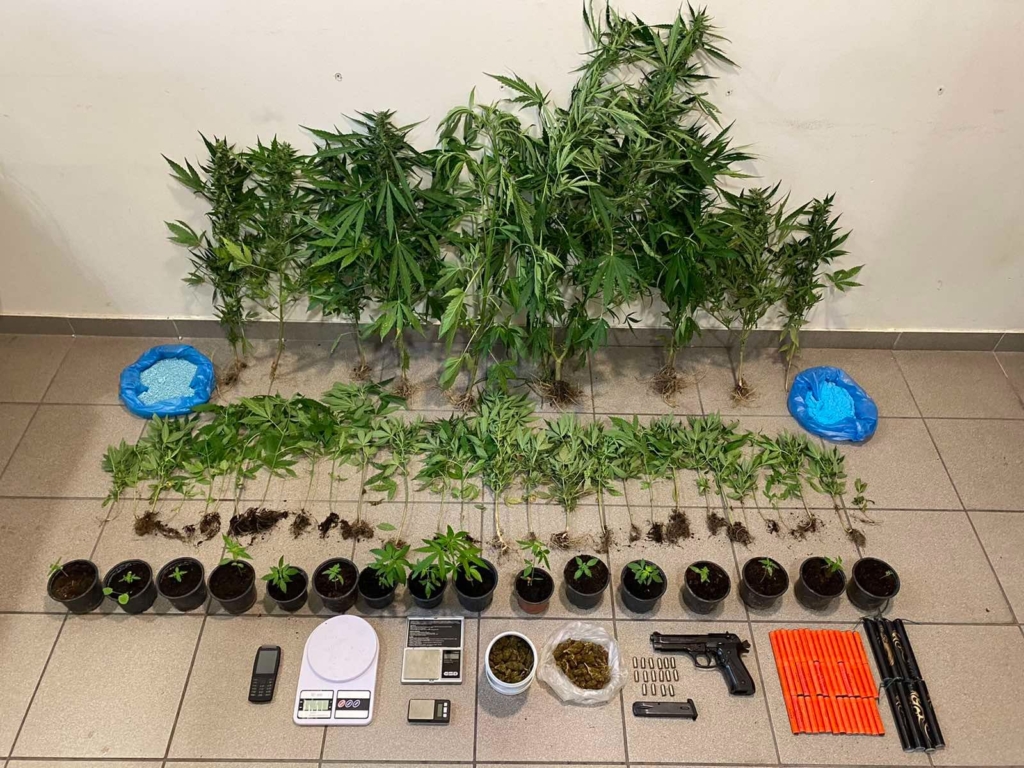 Κατασχέθηκαν μεταξύ άλλων, -39- δενδρύλλια κάνναβης, -16- φυτά κάνναβης, -111,3- γραμμάρια ακατέργαστης κάνναβης (χασίς) και πιστόλι κρότου λάμψης