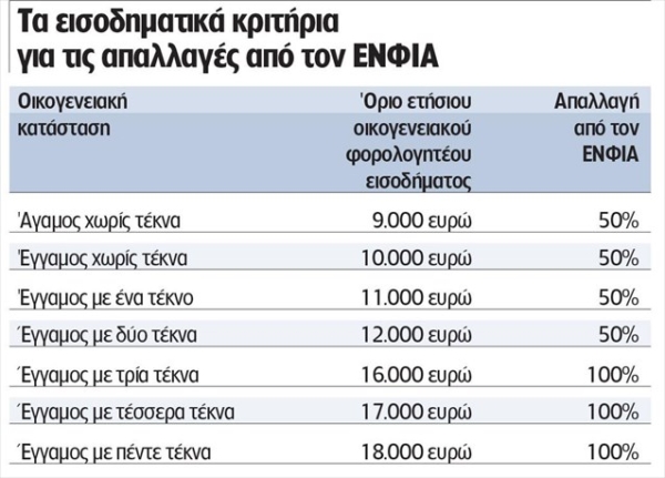 Σύμφωνα, ειδικότερα, με την ισχύουσα νομοθεσία, δικαιούχος απαλλαγής από το 50% του ΕΝΦΙΑ είναι κάθε φορολογούμενος που, μεταξύ άλλων, είχε κατά το προηγούμενο έτος «συνολικό ετήσιο καθαρό οικογενειακό εισόδημα» μέχρι 9.000 ευρώ.
