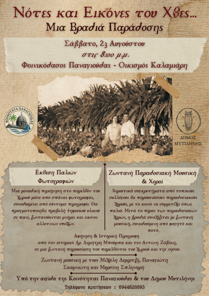 Η Κοινότητα Παναγιούδας και ο Δήμος Μυτιλήνης σας προσκαλούν σε μια μοναδική εκδήλωση που συνδυάζει πολιτισμό και διασκέδαση, ζωντανεύοντας μνήμες και εικόνες αλλοτινών εποχών.