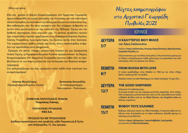 Η Περιφέρεια Βορείου Αιγαίου, δια της Αντιπεριφέρειας Πολιτισμού,  διοργανώνει και φέτος  τις «Νύχτες Κινηματογράφου στο Αρχοντικό Γεωργιάδη», με πρόγραμμα προβολών (επισυνάπτεται) από την Δευτέρα 5 Ιουλίου έως και την Πέμπτη 23  Σεπτεμβρίου , με δωρεάν είσοδο για τους πολίτες.