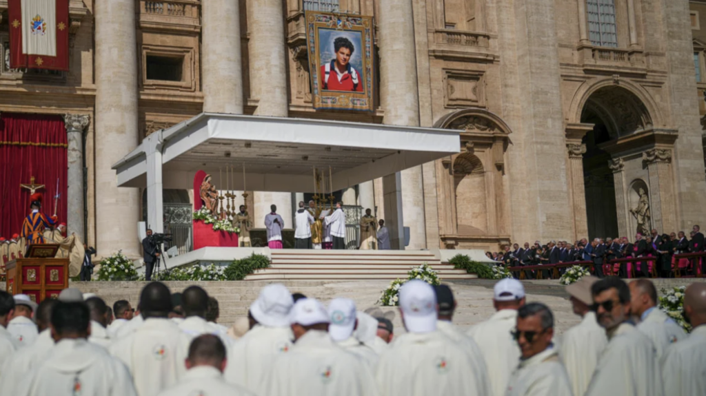 Εκατομμύρια πιστοί παρακολούθησαν από τις οθόνες τους σήμερα τον πάπα Λέοντα ΙΔ΄ να ανακηρύσσει άγιο τον Κάρλο Ακούτις στην πλατεία του Αγίου Πέτρου. Στην πρώτη τελετή αγιοκατάταξης της θητείας του ως ποντίφικας, ο Λέων ανακήρυξε επίσης άγιο έναν ιδιαίτερα αγαπητό Ιταλό που πέθανε σε νεαρή ηλικία, τον Πιερ Τζόρτζιο Φρασσάτι.