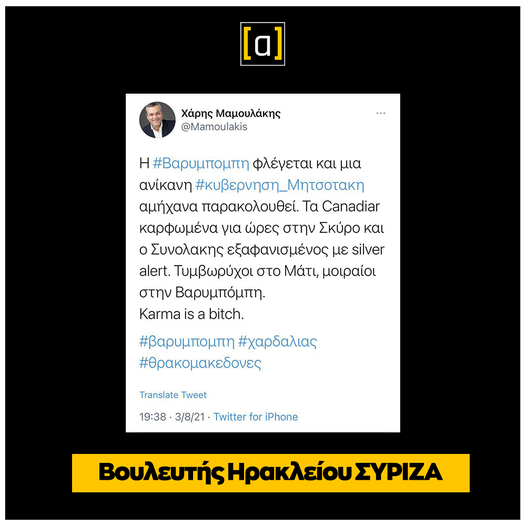 Ο Βουλευτής Ηρακλείου ΣΥΡΙΖΑ πριν καν σβηστεί η φωτιά προέβη στο ακόλουθο post στο twitter
