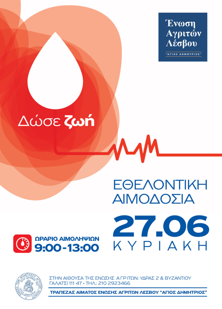 Η πιο κοντινή δράση εθελοντικής αιμοληψίας συλλόγου-μέλους μας, είναι την Κυριακή, 27 Ιουνίου, που θα πραγματοποιηθεί στην αίθουσα της Ένωσης Αγριτών Λέσβου (ένας σύλλογος με παράδοση στις κοινωνικές ενέργειες και πρωτοβουλίες).