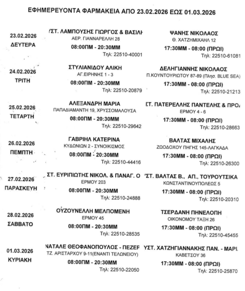 Ποια φαρμακεία εφημερεύουν 23/2 έως 1/3/2026