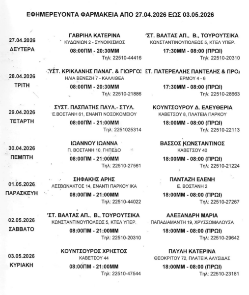 Ποια φαρμακεία εφημερεύουν από 27/4 έως 3/5/2026
