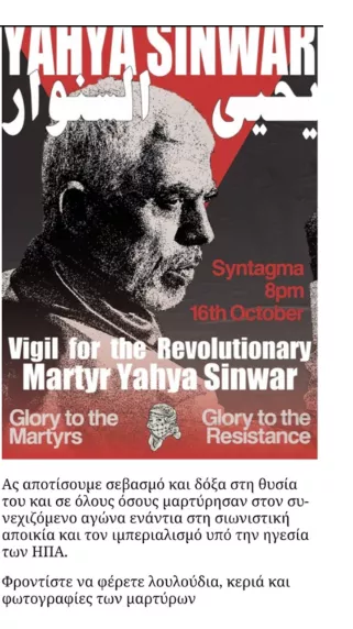 Τις τελευταίες μέρες στα κοινωνικά δίκτυα κυκλοφορεί μια πρόσκληση μιας δέησης στη Πλατεία Συντάγματος για τους μάρτυρες της Χαμάς και ειδικά έναν από τους ηγέτες της που εξολόθρευσαν οι ισραηλινές δυνάμεις, τον Σινουάρ.