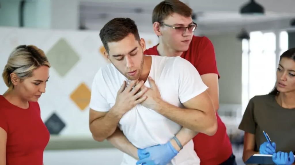 Όπως εξήγησαν εθελοντές του Ερυθρού Σταυρού, όταν ένας άνθρωπος αδυνατεί να αναπνεύσει, για όσο βήχει τον ενθαρρύνουμε να βήξει. Από τη στιγμή, όμως, που σταματάει ο βήχας ή αλλάζει πρόσωπο το χρώμα του ή μας κάνει το διεθνές σήμα πνιγμονής, τότε η πρώτη κίνηση είναι να βάλουμε το πόδι μας μπροστά από τα δικά του, να στηρίξουμε με το χέρι κάτω από τη μασχάλη τον θώρακά του και να του δώσουμε πέντε χτυπήματα στην πλάτη με όση δύναμη διαθέτουμε. Κάθε φορά, δε, ελέγχουμε αν έχει βγει το αντικείμενο που εμποδίζει την αναπνοή.