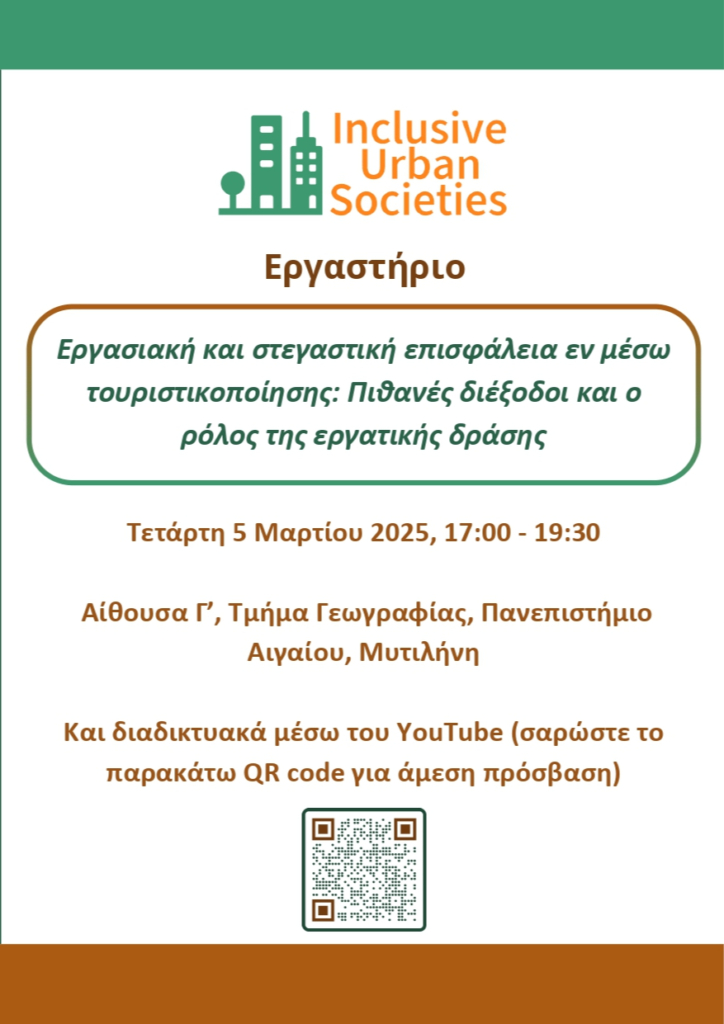 Την Τετάρτη 5 Μαρτίου, το έργο Inclusive Urban Societies, θα πραγματοποιήσει υβριδικό εργαστήριο που θα φέρει σε επαφή ακαδημαϊκούς ερευνητές, συνδικαλιστές και το ευρύ κοινό για να συζητήσουν τις προκλήσεις της εργασιακής και στεγαστικής επισφάλειας ως αποτέλεσμα της τουριστικοποίησης. Πέρα από την αποτύπωση της τρέχουσας κατάστασης, το εργαστήριο φιλοδοξεί να συνεισφέρει στη διερεύνηση αποτελεσματικών στρατηγικών προς όφελος των εργαζομένων.