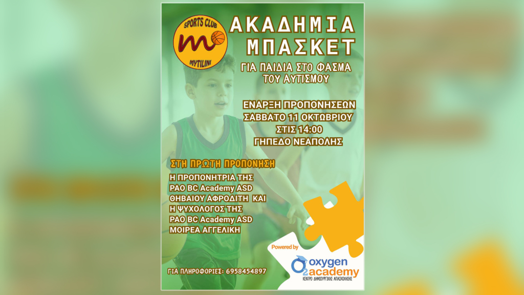 Μια νέα δράση κοινωνικής ένταξης μέσα από τον αθλητισμό ξεκινά στη Μυτιλήνη. Το Sports Club Mytilene και το ΚΔΑΠ Oxygen Academy, με την υποστήριξη της PAO BC Academy ASD, ανακοινώνουν την έναρξη ενός προγράμματος μπάσκετ ειδικά σχεδιασμένου για παιδιά στο φάσμα του αυτισμού.