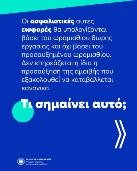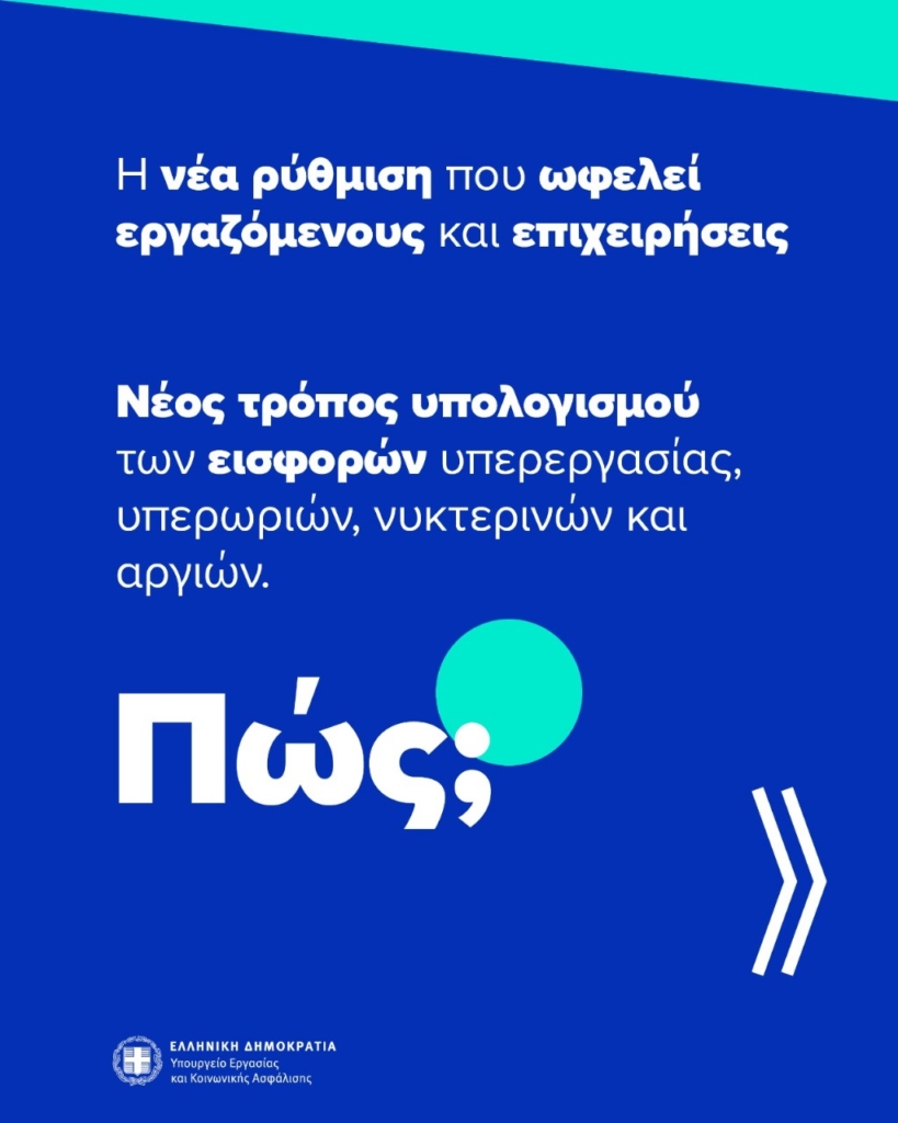 «Το Υπουργείο Εργασίας προχωρά σε νέα ρύθμιση για τη κατάργηση των προσαυξήσεων στις ασφαλιστικές εισφορές που αφορούν υπερεργασία, υπερωρίες, νυχτερινή εργασία, και απασχόληση σε Κυριακές και αργίες. Η ρύθμιση αυτή δεν επηρεάζει το ύψος των προσαυξήσεων που προβλέπονται για την αμοιβή της υπερεργασίας, των υπερωριών, της νυχτερινής εργασίας και της απασχόλησης σε Κυριακές και αργίες, οι οποίες εξακολουθούν να καταβάλλονται κανονικά. Η πρωτοβουλία αυτή αποτελεί συνέχεια της οριζόντιας μείωσης των ασφαλιστικών εισφορών κατά 5,4 ποσοστιαίες μονάδες από το 2019, που έχει συμβάλει αποφασιστικά στην αύξηση της απασχόλησης και τη μείωση του ποσοστού ανεργίας στη χώρα μας. Σαν αποτέλεσμα της ρύθμισης μειώνεται το μη μισθολογικό κόστος των επιχειρήσεων και ενισχύεται το διαθέσιμο εισόδημα των μισθωτών πλήρους απασχόλησης. Με αυτή τη ρύθμιση βελτιώνεται η ανταγωνιστικότητα της οικονομίας, αμβλύνονται οι «στενότητες» που παρατηρούνται σε πολλούς κλάδους οικονομικής δραστηριότητας και αναβαθμίζεται το βιοτικό επίπεδο των εργαζομένων».